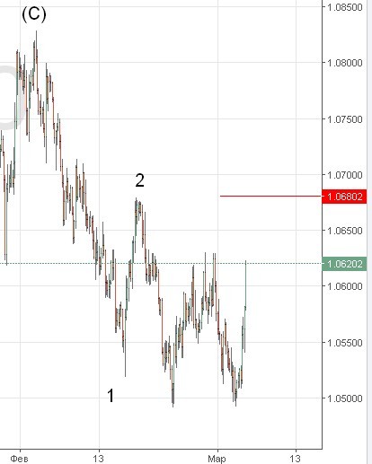 Несмотря на то, что мы не прошли красной отметки, предлагаем вариант движение пары к паритету (пока 50 на 50) . Движение выше красного уровня отменит этот сценарий и подтвердит наш старый. Сентимент в 10% быков, говорит , что потенциал для снижения слабый, однако на рынке бывали случаи, когда на перепроданном рынке цена падала. Будем наблюдать за волновой структурой и уровнями для подтверждения сценария.