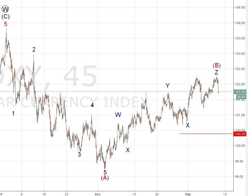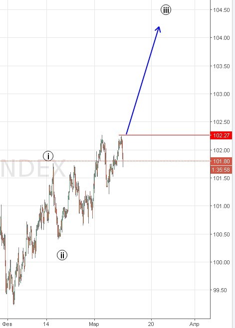 2) Альтернативная. Мы пойдем на новые максимумы выше 104 , и только после этого на 92-94. Уровень 100.67 — отмена сценария , новый максимум 102.27 один из уровней подтверждения.