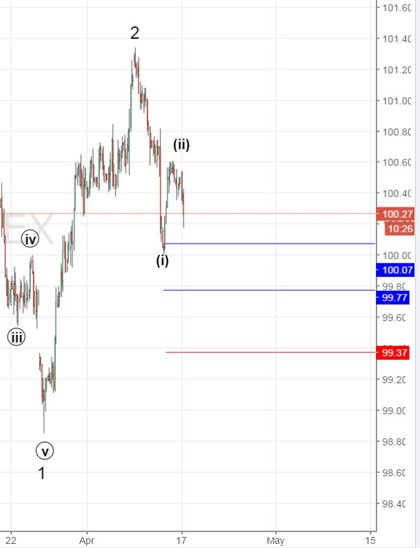 Наш основной вариант о окончании коррекции остается прежним. Красный — уровень подтверждения. Движение выше 101.4 будет означать развитие альтернативного сценария.