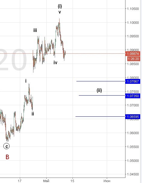 Мы перешли на вариант более глубокой коррекции к синим уровням (самый нижний крайний , его пробитие будет означать пересмотр сценария).