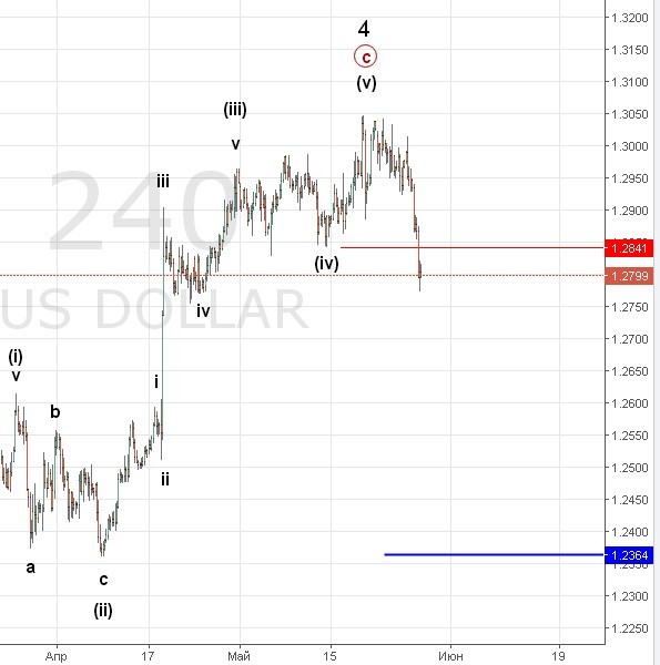 Фунт пробил наш красный уровень. Вполне вероятно — это может коррекция волна (iv) с последующим ростом в волне (v). Движение ниже 1.26 будет первым сигналом, что долгосрочный разворот начался (показано на графике) , окончательно подтвердит его пробитие синей отметки. Движение выше 1.295 — даст сигнал, что мы еще увидим 1.33-1.35. 53% быков.