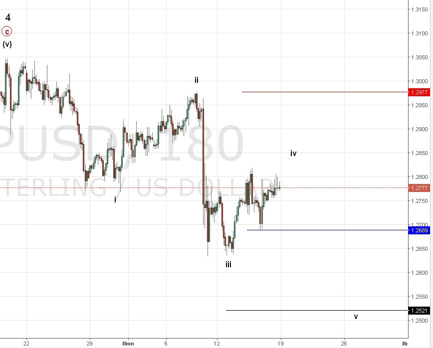 На данный момент сложно выделить четкий сценарий в движении пары. Наш основной (график) предполагает, что мы чертим начальную диагональ и после некоторого укрепления фунт продолжит снижение. Пробитие красной линии отменит данный сценарий , преодоление синей — подтвердит. 63% быков.