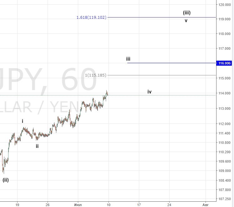 09.07 Опубликовано09.07.2017Авторadmin ПоделитьсяИена продолжает предполагаемое ослабление. Считаем, что движение будет развиваться как показано на графике. Падение ниже 111.8 отменит данный сценарий. 63% быков. Поделиться