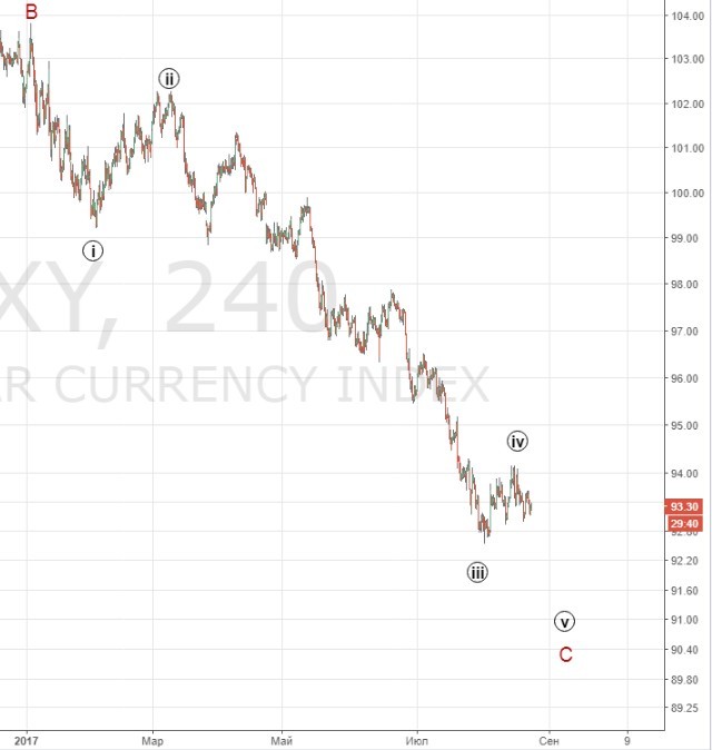 Развитие волновой структуры индекса свидетельствует, что это больше была коррекция , а не начало роста. Поэтому мы переходим к альтернативному сценарию и считаем , что будет сделано одно подразделение вниз к 92-91 (более точно цели будут уточнены). Движение выше 94.2 отменит данный сценарий.