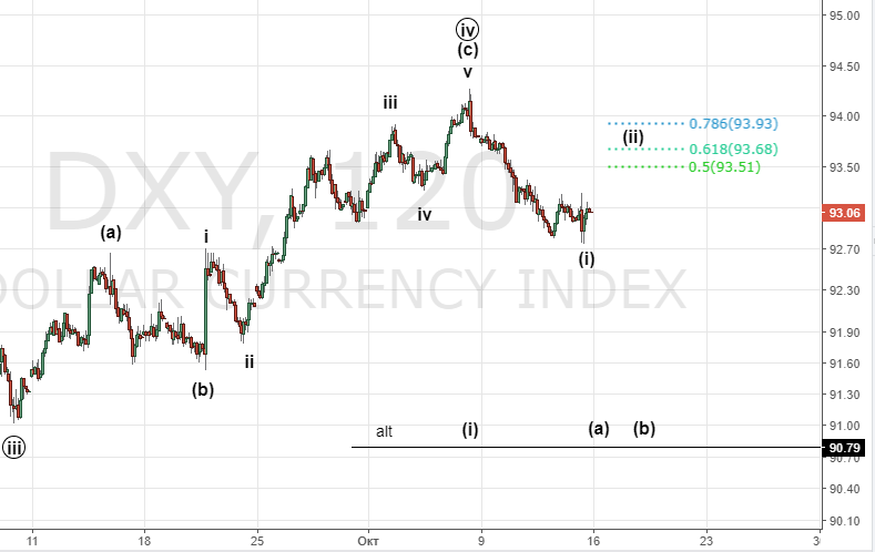 Как ожидалось: индекс на этой неделе снизился. В текущей ситуации видим два равноценных сценария .1. Снижение продолжится , мы сделали в нем волну (i) и теперь делаем коррекцию (ii) . 2. Индекс сделал импульс вверх и сейчас делаем коррекцию к нему (abc) в район 92 . В ближайшую неделе в любом случае ожидаем рост, после чего ждем как определится движение. 59% быков.