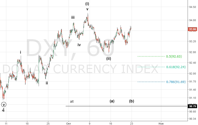 Развитие движения делает основным вариантом начало разворота от 91. На графике представлены два сценария развития движения . Снижение ниже 93.06 укажет на альтернативный сценарий с целями в районе 92.2 . Новый максимум подтвердит основной сценарий. Если индекс уйдет ниже 91.7 , мы будем рассматривать вариант новых минимумов. 64% быков.