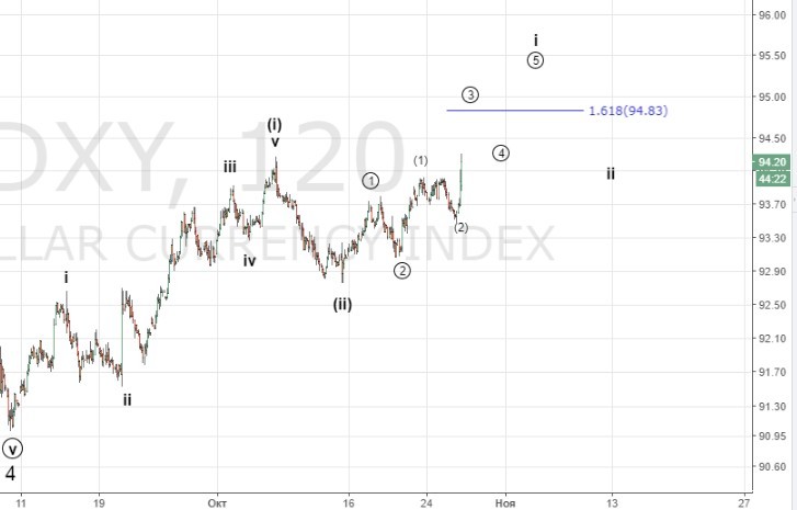 26.10 Опубликовано26.10.2017Авторadmin ПоделитьсяСчитаем, что разворот индекса от 91 состоялся и мы продолжим рост как показано на графике. Снижение ниже 93.45 отменит данный сценарий. Поделиться