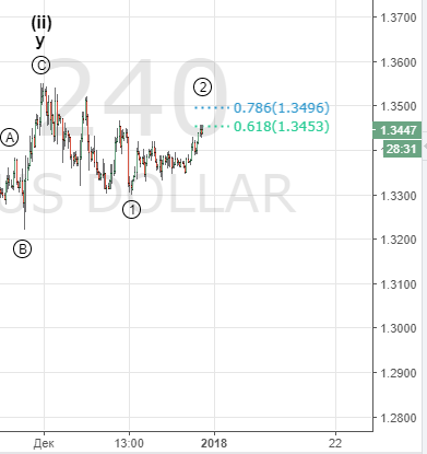 Ситуация по фунту остаётся сложно для анализа . На графике представлен вариант начальной диагонали и коррекции к ней. Движение выше 1.35 сделает основном вариантом рост выше новых максимумов (выше 1.365)