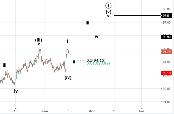 17.06 Опубликовано17.06.201817.06.2018Авторadmin ПоделитьсяИндекс продолжил рост преодолев отметку 95. В ближайшее время ожидаем начало коррекции ( или уже идет) к указанным уровням. Первая цель окончания движения 95.9 , вторая 97.5 . Рекомендация: покупаем на откате со стопом 93.18 . Поделиться