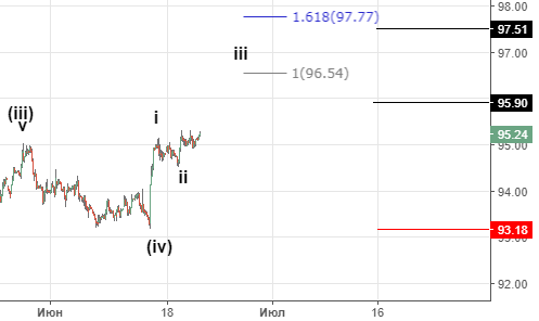 Очень вероятно , что коррекция ii уже закончилась. На графике указаны первая и вторая цели для iii . Рекомендация: можно покупать со стопом 94.5 . Его преодоление включит альтернативный сценарий продолжения коррекции.