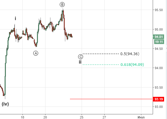 Движение сделало зигзаз вниз и зигзаг  вверх, а это значит развивается плоская коррекция основные цели которой указаны на графике. Рекомендация: дожидаемся этих уровней и покупаем со стопом 93.2 , если сделали уже это — переместить стоп к этой отметке.