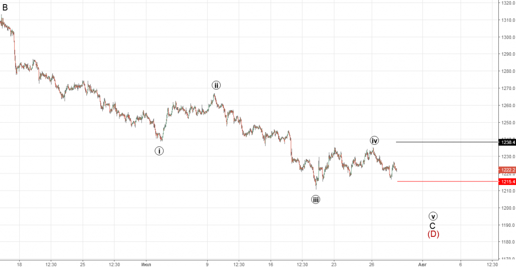 29.07.Волновая структура от 1210 куда больше похожа на коррекцию , чем на начало восходящего движения. В связи с этим склоняемся сценарию с новым локальным минимумом. Рекомендация: пока стоп остаётся нетронутым – наблюдаем , если 1215 , а потом 1210 будут пройдены , будем ждать новой точки входа.(ссылка).