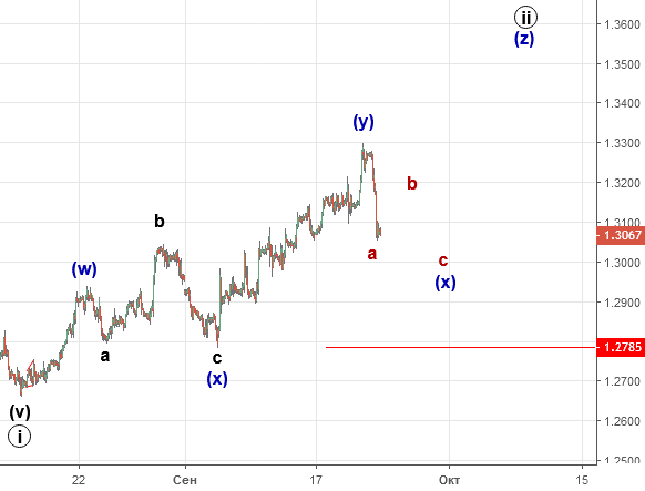 Движение от 1.2785 так и не сформировало четкого импульса , поэтому переходим на сценарий тройного зигзага. Краткосрочная ситуация для анализа становится достаточно сложной , тем не менее , уровни ((ii)) ещё не выполнены , сентимент 49% быков нельзя назвать разворотным , поэтому ожидаем продолжение роста.  Стоп остаётся прежним.