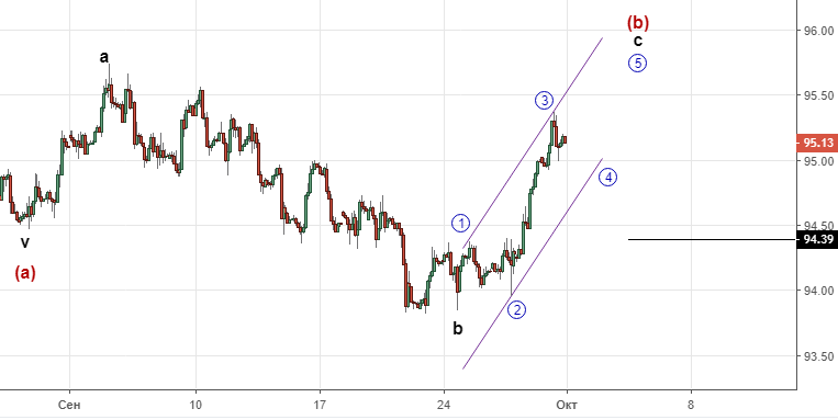 Считаем, что импульс в волне с ещё не сформирован и движение пойдет ко второй цели 95.7. Рекомендация: можно продавать в районе этой отметки , более надёжный вариант дождаться подтверждения дальнейшего снижения преодолением отметки 94.4