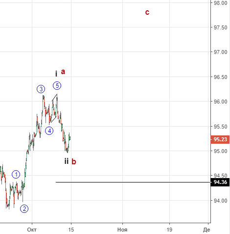 Поднявшись немного выше 96.12 индекс начал снижение , однако импульс в нём не просматривается , поэтому считаем,что можно рассматривать сценарий окончания коррекции чуть выше 1.18 и продолжение падения к паритету и ниже. В этот же вариант вписывается расширяющаяся плоская ( её часть (b) красным) с последующим снижением (с) к ранее обозначенным целям. Ситуация остаётся достаточно запутанной , будем ждать её прояснения.