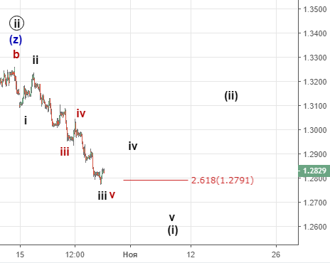 Считаем , что сейчас формируется импульс вниз . В ближайшее время ожидаем откат , продолжение снижения и коррекцию (ii). Альтернативный сценарий (красным) предполагает начало (ii) приблизительно с текущих . Рекомендация: ожидаем возможность входа в позицию.
