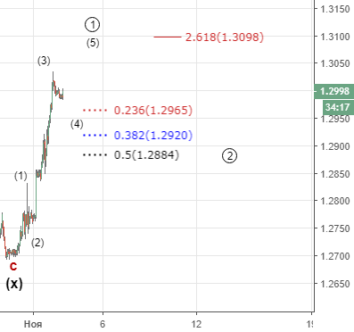 Среднесрочная структура движения от середины августа является крайне запутанной для интерпретации (имеет множество вариантов). Поэтому на данный момент ориентиемся на краткосрочные движения. Считаем , что сейчас формируется импульс вверх ( показан на графике) , альтернативный вариант предполагает окончание (3) на отметке 1.301 , только потом (4) (5). В любом случае стоит дождаться коррекции 2(кружок) и понаблюдать за её формой .