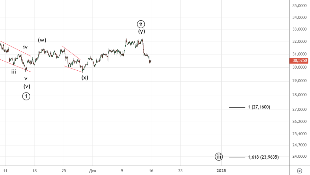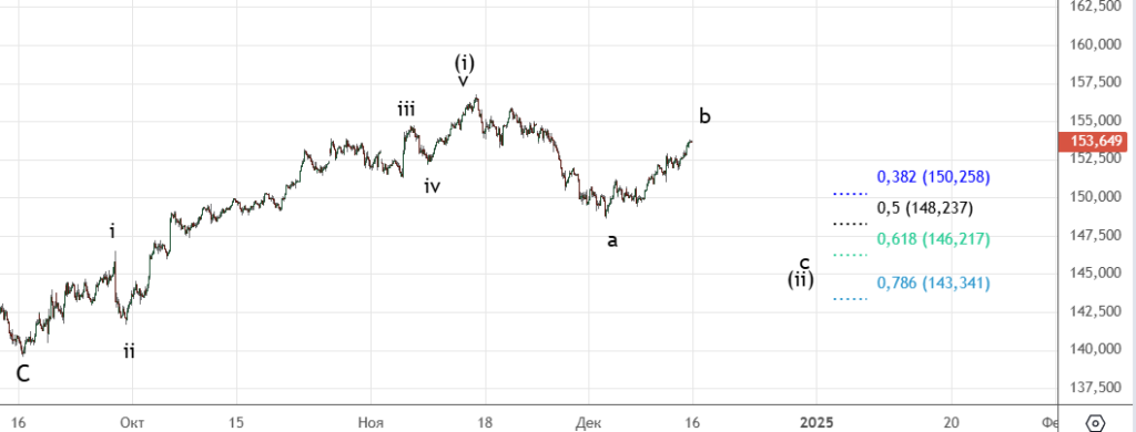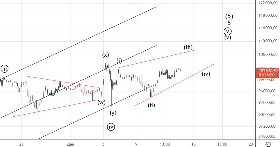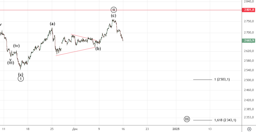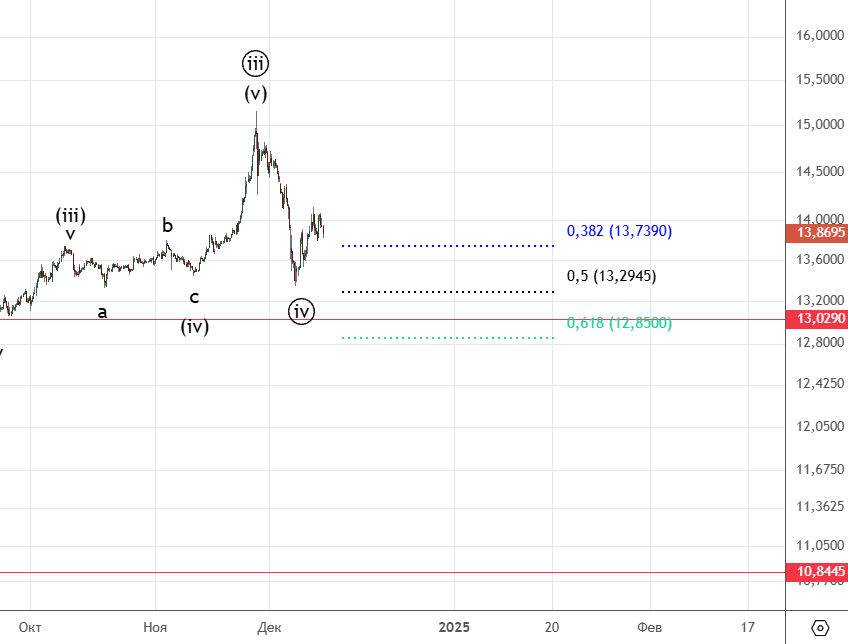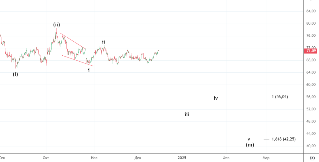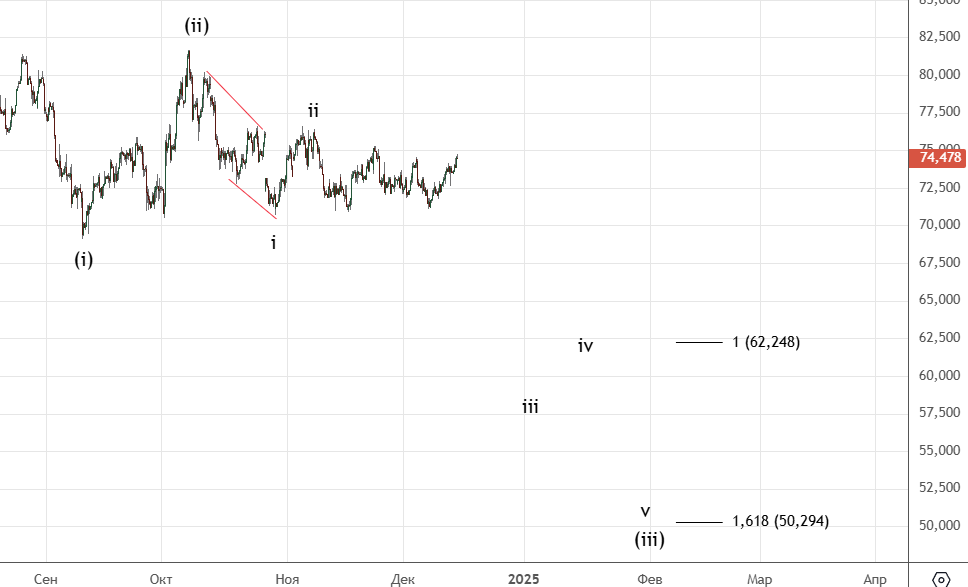 Движение вниз от 8-го декабря можно посчитать как импульс (хотя он немного спорный) . Вверх прошел зигзаг (а) . Волна ((ii)) скорее всего еще не закончилась и будет иметь форму плоской коррекции.