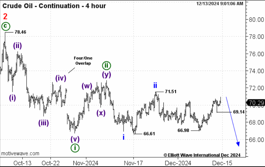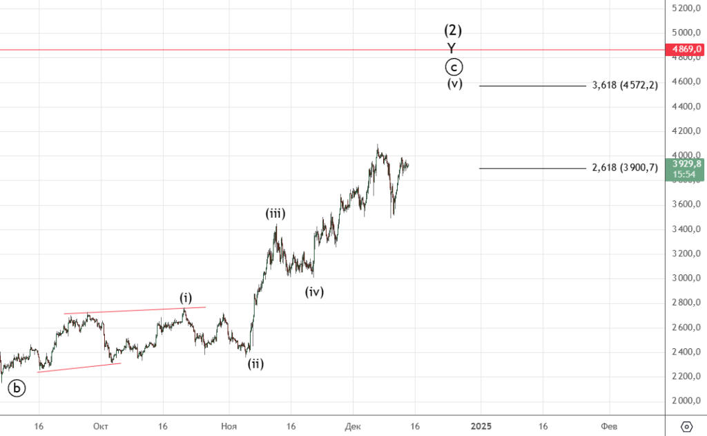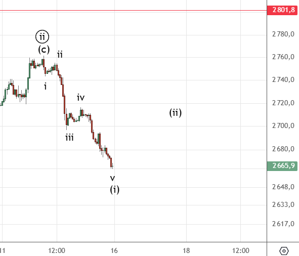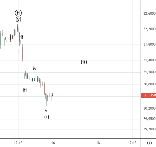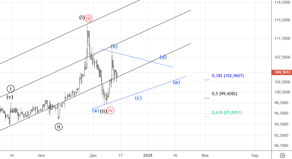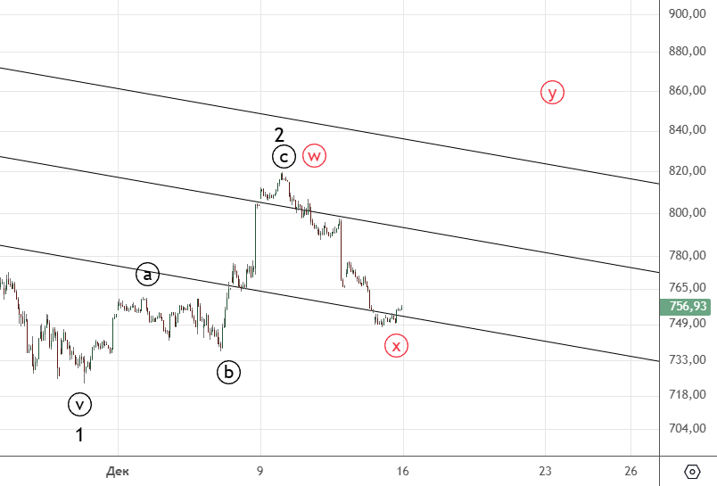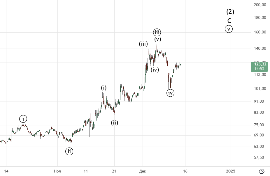 Движение вниз от 8-го декабря можно посчитать как импульс (хотя он немного спорный) . Вверх прошел зигзаг (а) . Волна ((ii)) скорее всего еще не закончилась и будет иметь форму плоской коррекции.