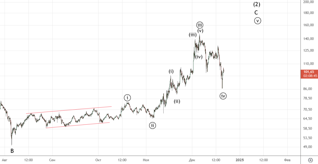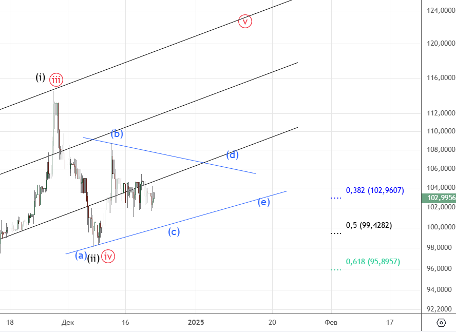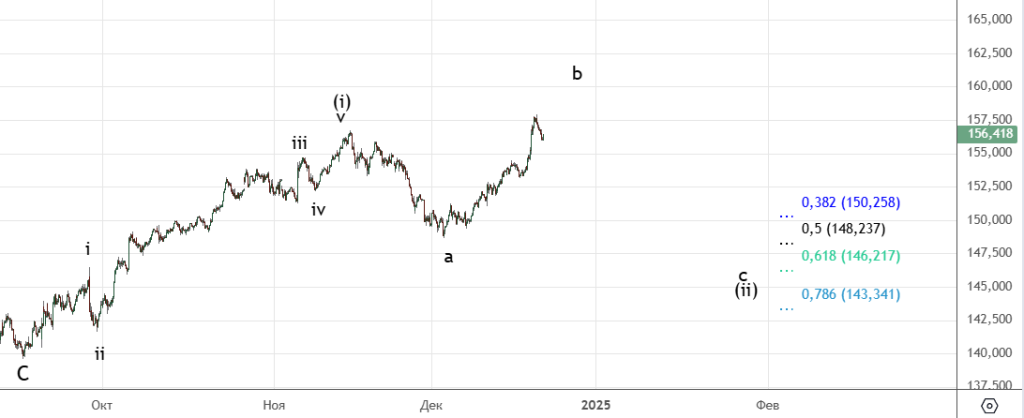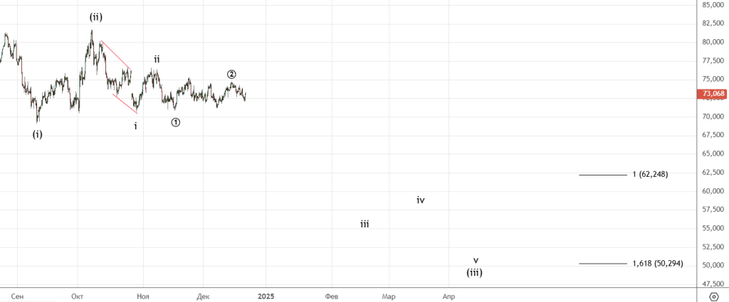 Сделали новую вершину . Больше похоже , что идет плоская в волне (ii) т.к. в скором времени после завершения роста индекса доллара должна начаться его коррекция . Альтернатива — (ii) уже закончилась.