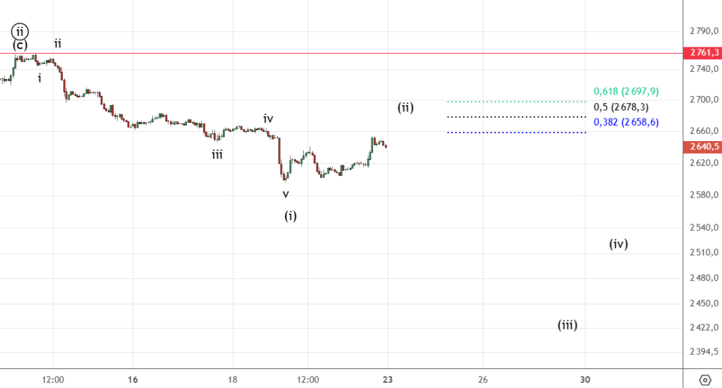 Вносятся некоторые корректировки . Скорее всего волна (i) завершилась только 19.12 и сейчас идет (ii) . Такое предположение соответствует циклическому анализу , где минимумы должны быть 10.12 — 24.12 , как раз в них и попали. Сейчас идем на вершину нового цикла. Стоп — 2761.3
