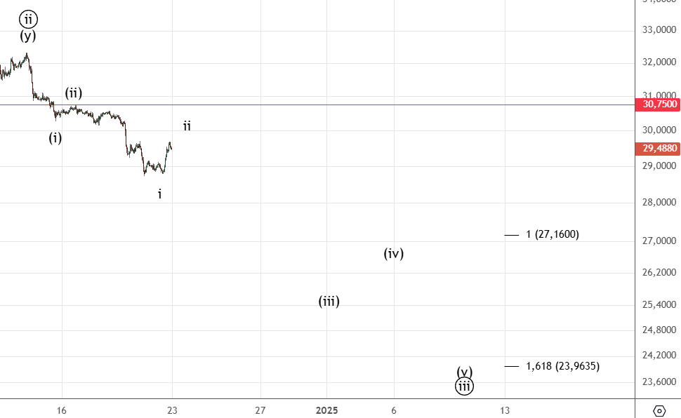 Снижение идет более активно , чем в золоте . Вполне вероятно у нас идет серия 1-2 1-2. Стоп — 30.75