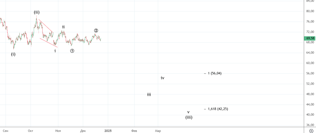 По структуре движения вниз пока прошел только зигзаг , разворот не подтвержден. Ситуация похожа на S&P500 : надо делать еще одно подразделение вниз .