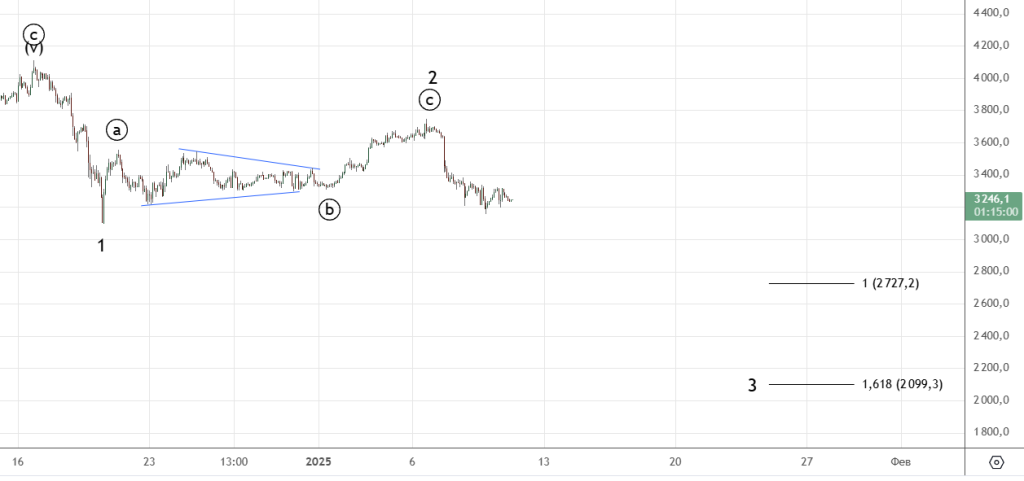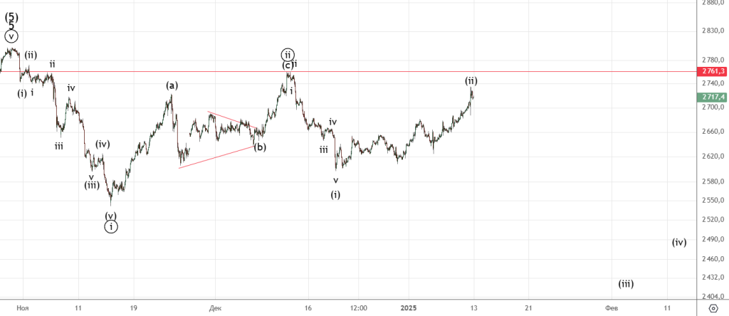 Коррекция получается глубокой . Пока ничего не нарушено , отметка 2761.3 не пройдена. Если пройдем , то лучше будет просто понаблюдать за развитием некоторое время.