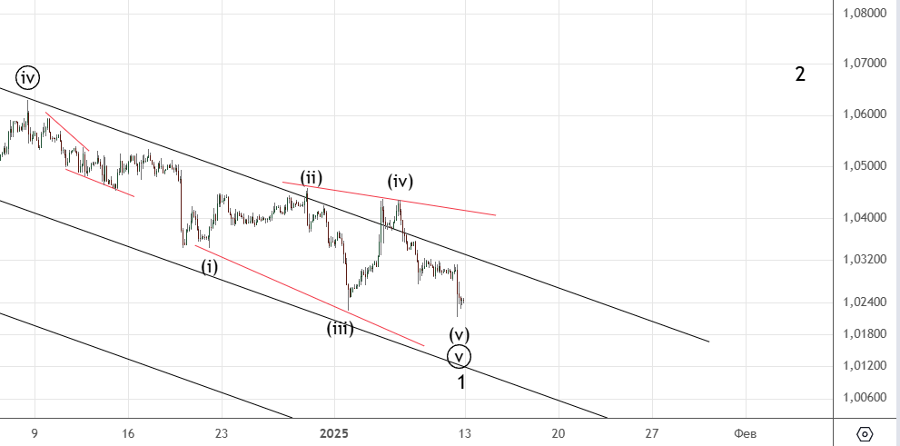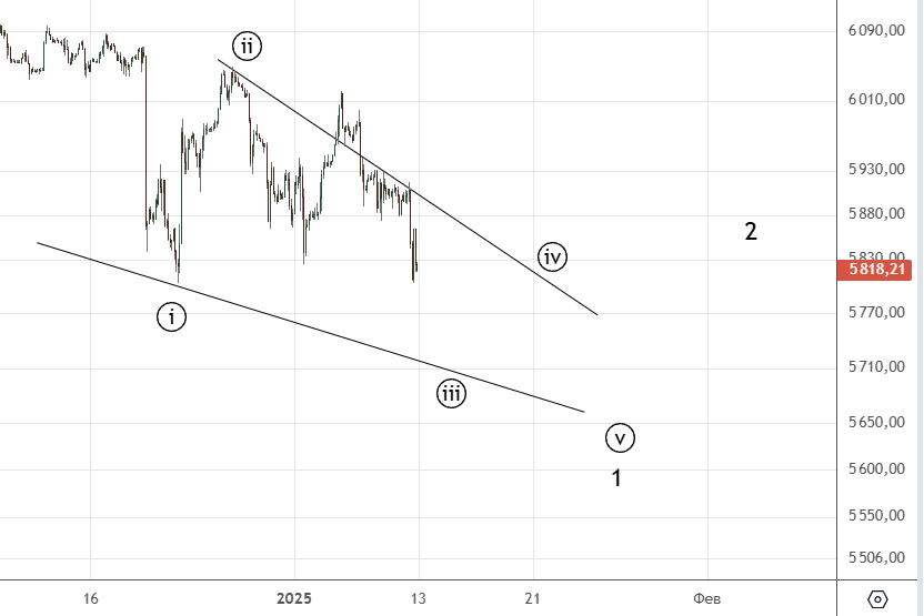 Поскольку индекс обновил минимум , есть смысл рассматривать вариант разворота. На графике показана начальная диагональ . Пока нужно некоторое время понаблюдать за развитием , ситуация очень запутанная.
