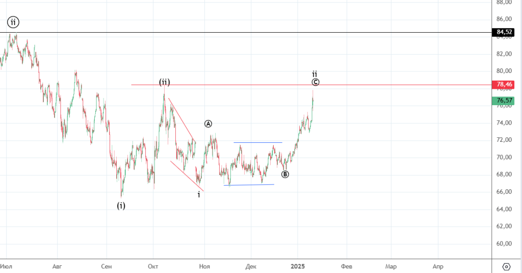 Началось укрепление рубля на данный момент есть два варианта 1. Синим . Сделали укороченную ((v)) и началась коррекция всего движения от 82.7 2. Красным. Все еще идет коррекция ((iv)) , в данном случае это плоская коррекция.