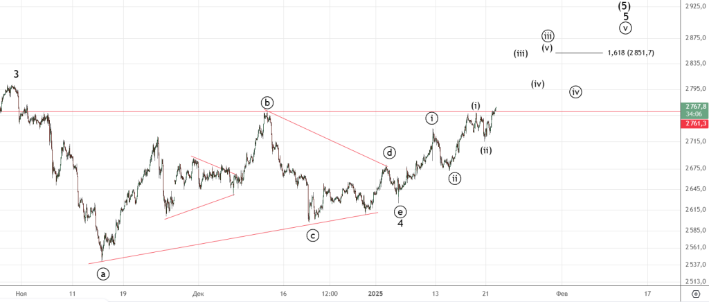 Пробили 2761.3 , сценарий роста подтверждается . Отмечена основная цель для волны ((iii)) .
