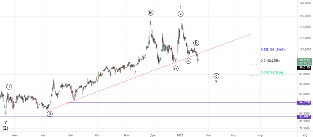Укрепление рубля продолжается. Закрепились ниже трендовой. Есть еще важная отметка в районе 99.
