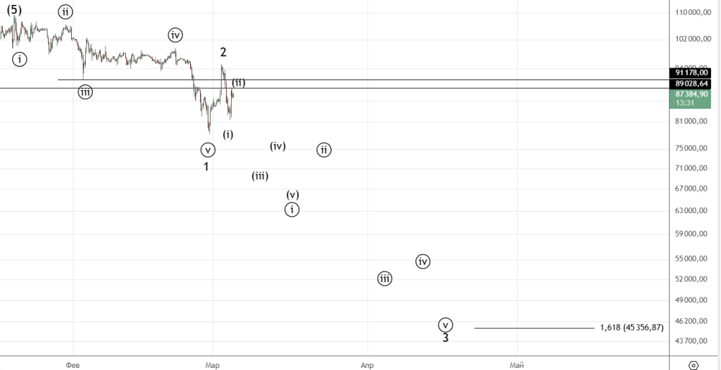 Как ожидалось сделали коррекцию 2 , падение возобновилось . Цель для 3 — 43356 .