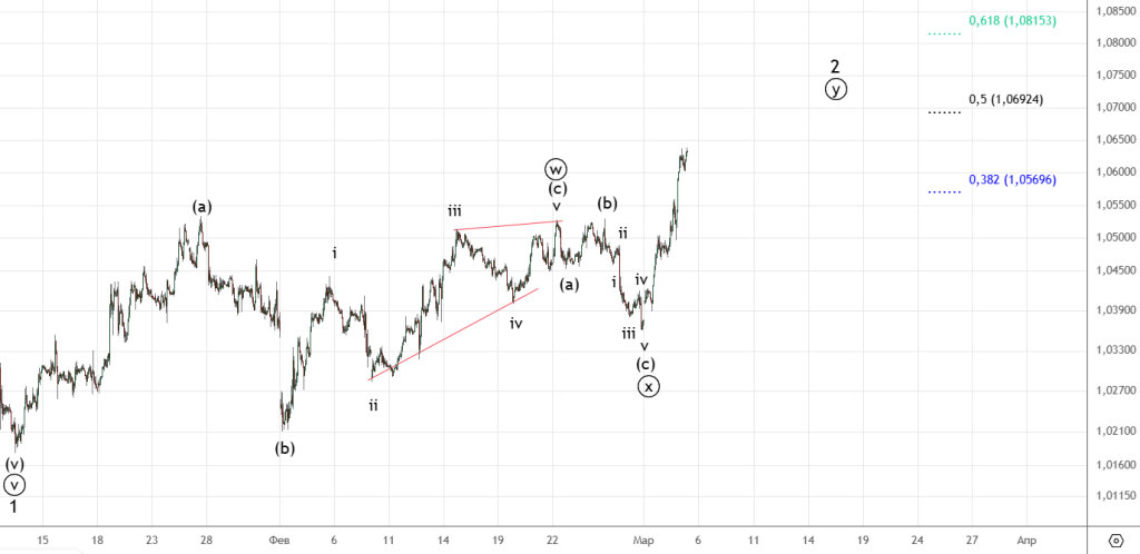 Импульс вниз оказался волной (с) в плоской коррекции ((x)) , ослабление доллара возобновилась. Цель 1.07.