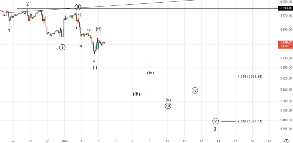 Падение продолжается . Более актуальной выглядит цель 5395 . Схематично показано дальнейшее развитие. Возможно (ii) еще не закончилась.