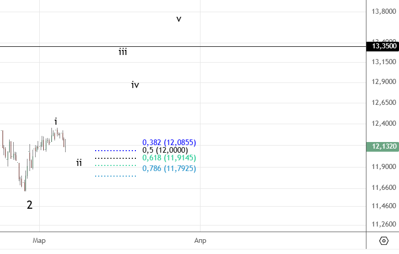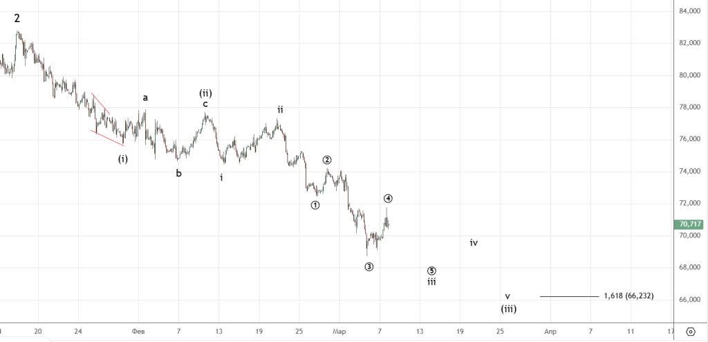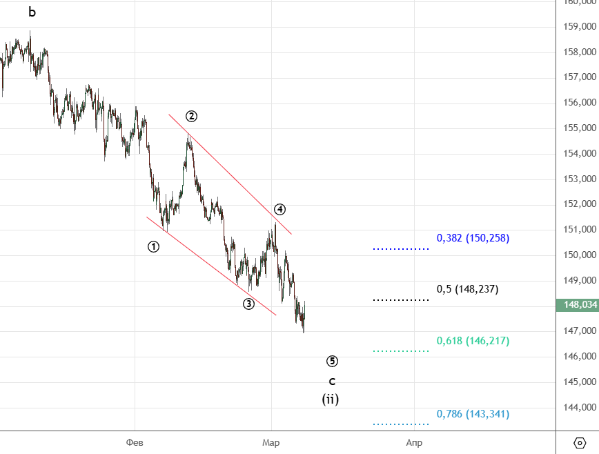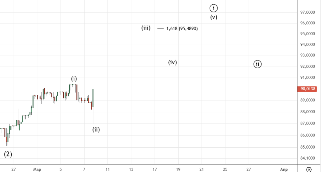 На этой неделе волатильность была невысокой. Движение вверх можно посчитать как импульс , пусть и спорный . Движение вниз больше похоже на коррекцию , т.е. скорее всего сделали (i) — (ii) . Ожидается продолжение роста , ближайшая цель 95.49 . Важно сделать более серьёзное движение , как схематично показано на графике.