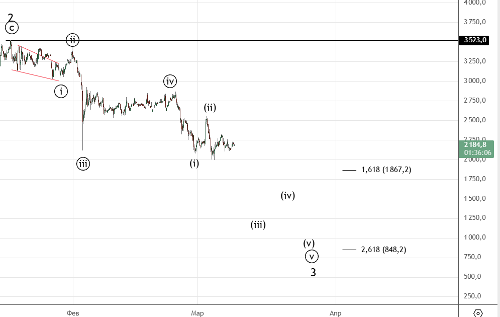Волатильность была низкой . Изменений особых нет . Скорее всего завершился импульс (i) и идет коррекция (ii) , после рост возобновится. Стоп — 2844.1