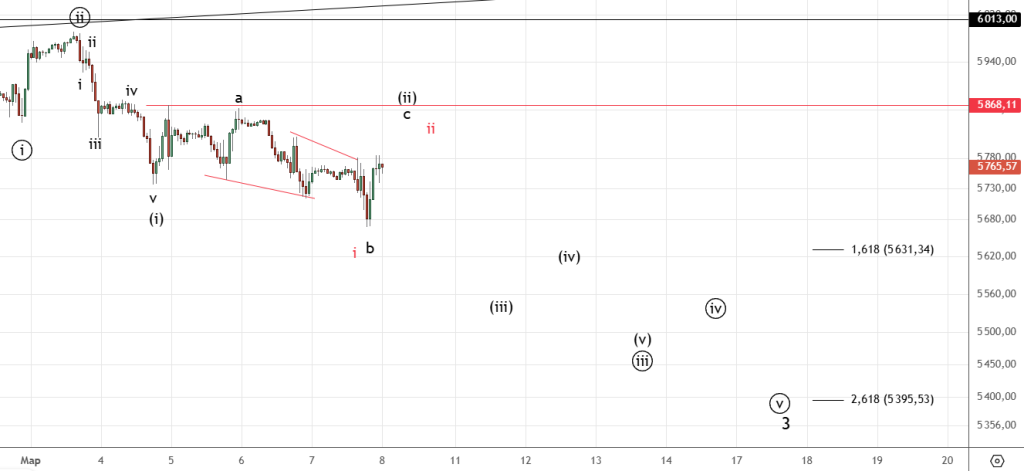 Показаны два варианта . Черным — аналогичный DJ . Красным — начальная диагональ в волне i , рост продолжится , но не выше 5868.11.