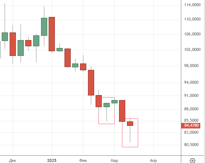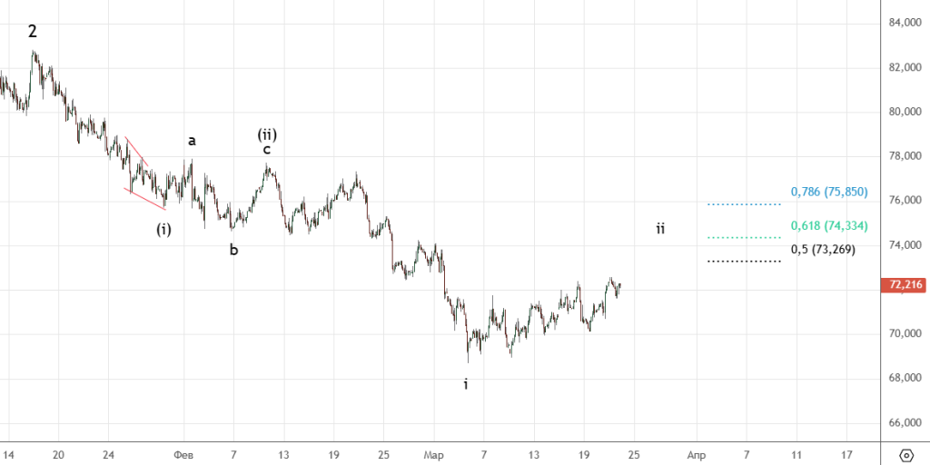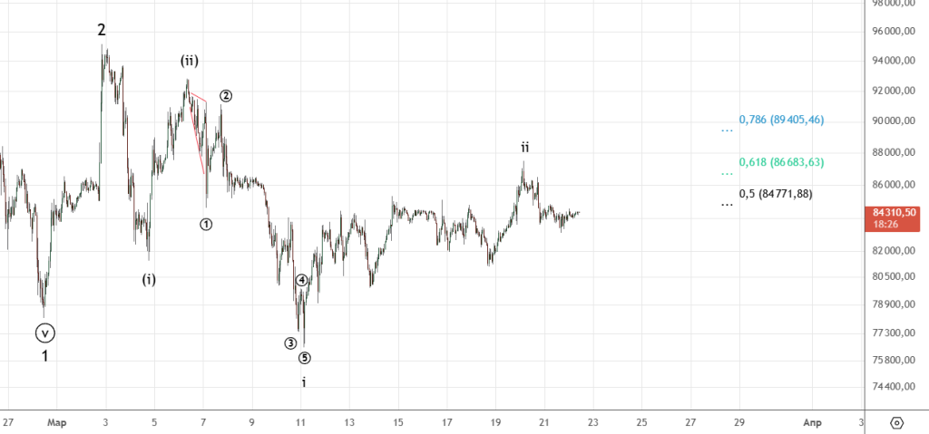 Началось движение вверх , тестируем 85.125 . На следующей неделе желательно сделать еще одно подразделение вверх , тогда можно будет говорить о импульсе в волне ((i)) . После увидим коррекцию ((ii)).
