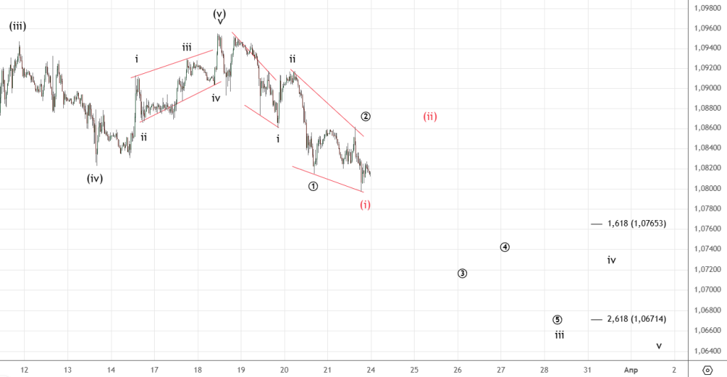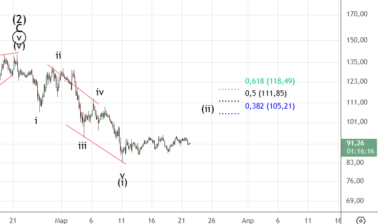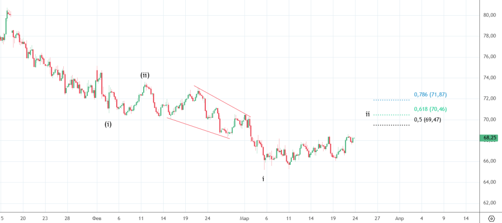 Все неделю шла коррекция ((iv)), возможно она еще не закончилась . Но в любом случае ожидается возобновление падения.