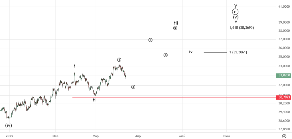 Скорее всего идет коррекция ((2)) . Важный уровень (стоп) 30.7993