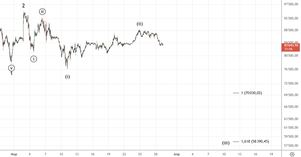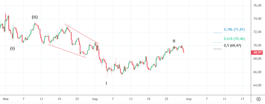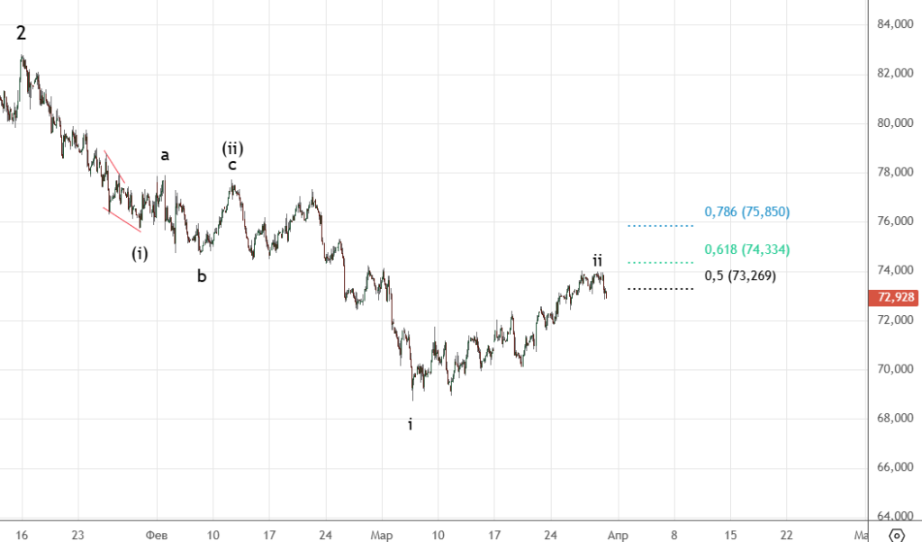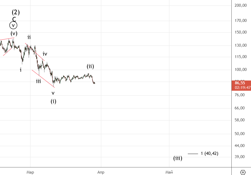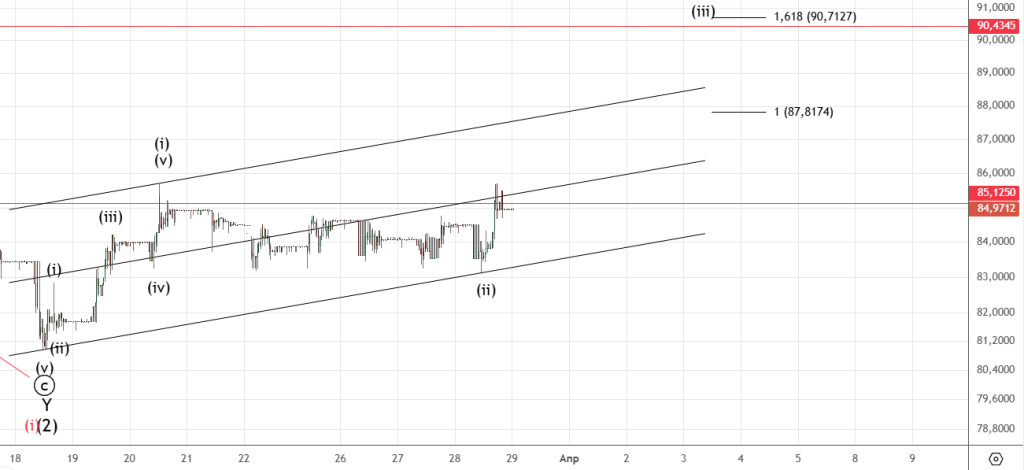 Сделали еще одно небольшое движение вниз , в пятницу рост возобновился. Снова пробуем пройти 85.125 . Если коррекция (ii) закончилась , то основная цель 90.71.