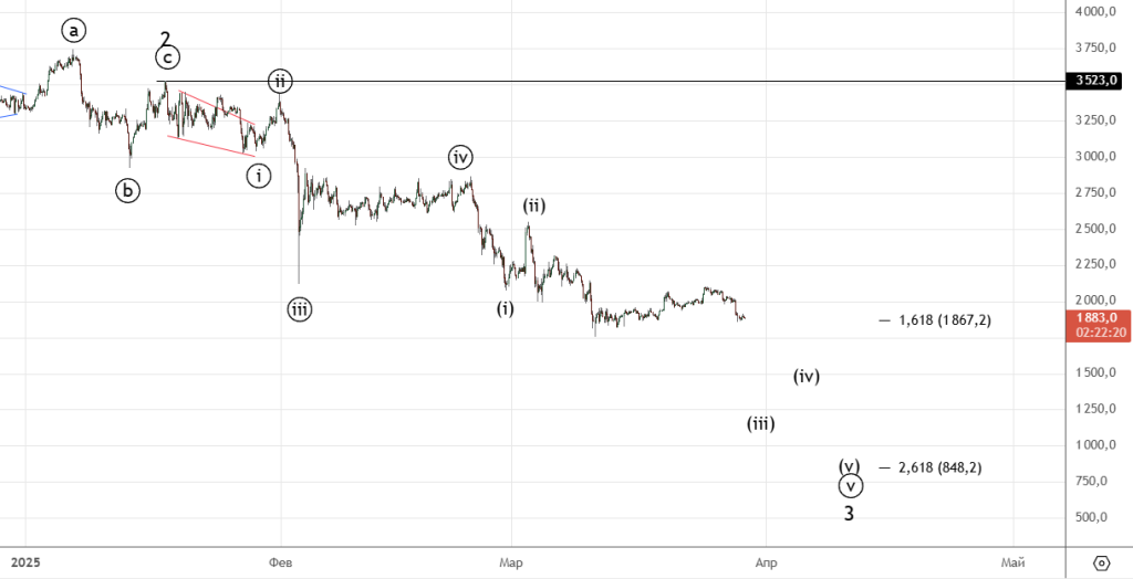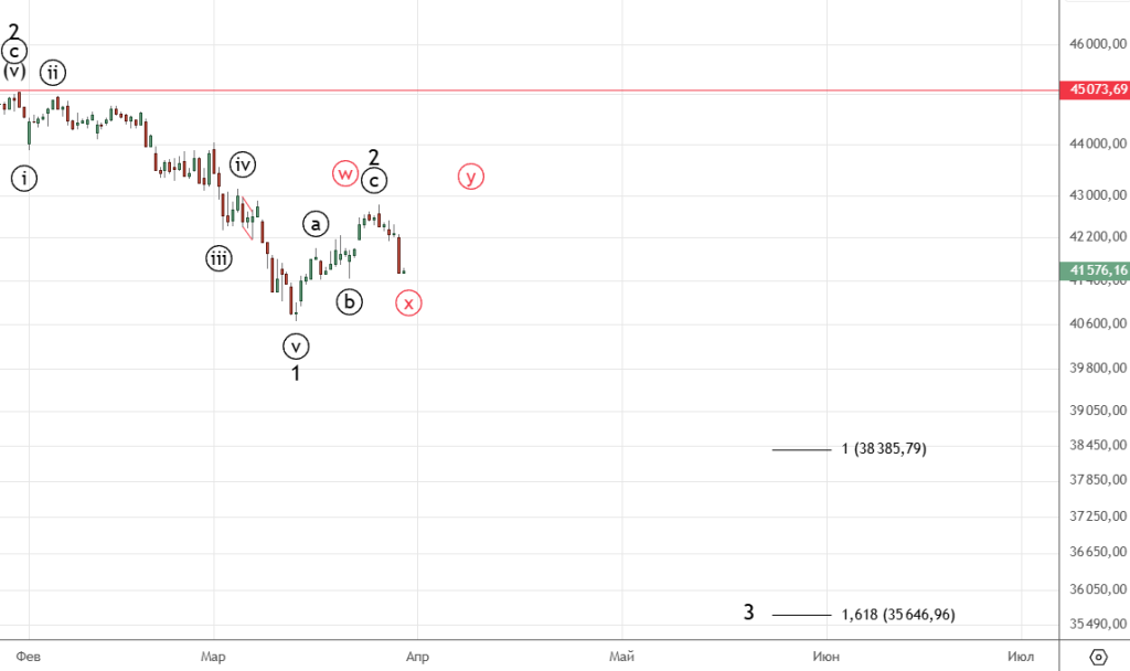 Совсем немного не дотянули до цели 0.5 , падение возобновилось. Похоже на этом коррекция 2 закончилась , указаны цели для 3 . Альтернатива красным — двойной зигзаг , продолжение 2 и только потом разворот.