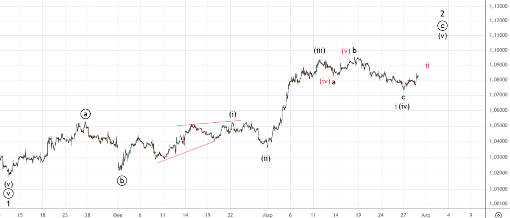 Сделали небольшое движение вниз , но 1.07 не достигли. Волновая структура остаётся сильно запутанной , основной вариант продолжение роста . Красным альтернатива — разворот .