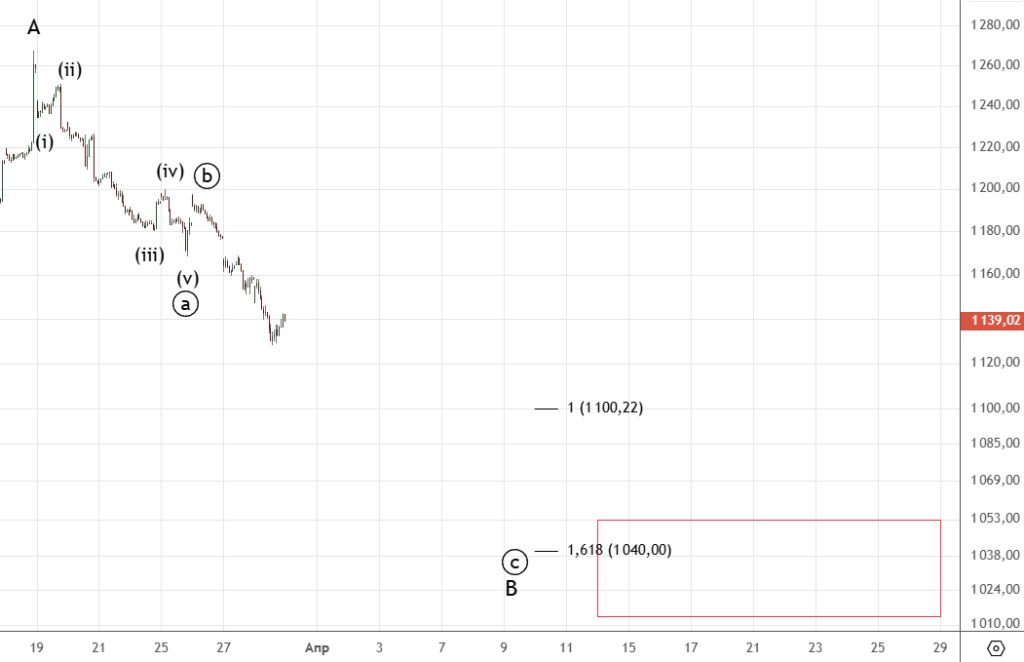 Отскок вверх оказался незначительным , падение возобновилось. Первая цель 1100 и 1040 ( как раз в указанный ранее диапазон). Пока что это движение рассматривается как коррекция В , но если вниз сформируется импульс , то можно будет говорить о развороте.