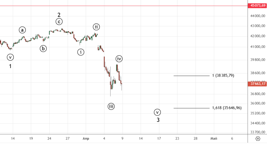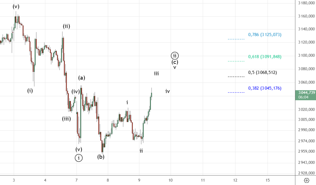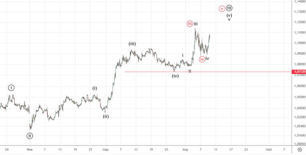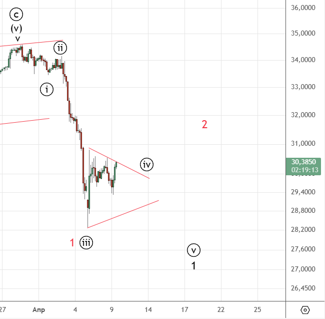 Тут не хватает еще одного движения вниз , поэтому скорее всего сейчас идет волна ((iv)) ( на графике треугольник). Альтернатива — 1 уже закончилась и идет 2 , как в золоте.