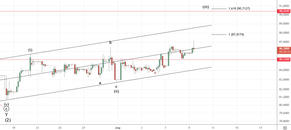 Похоже смогли закрепиться выше 85.125 , ждем движение к верхней границе канала , потом на 90.7.