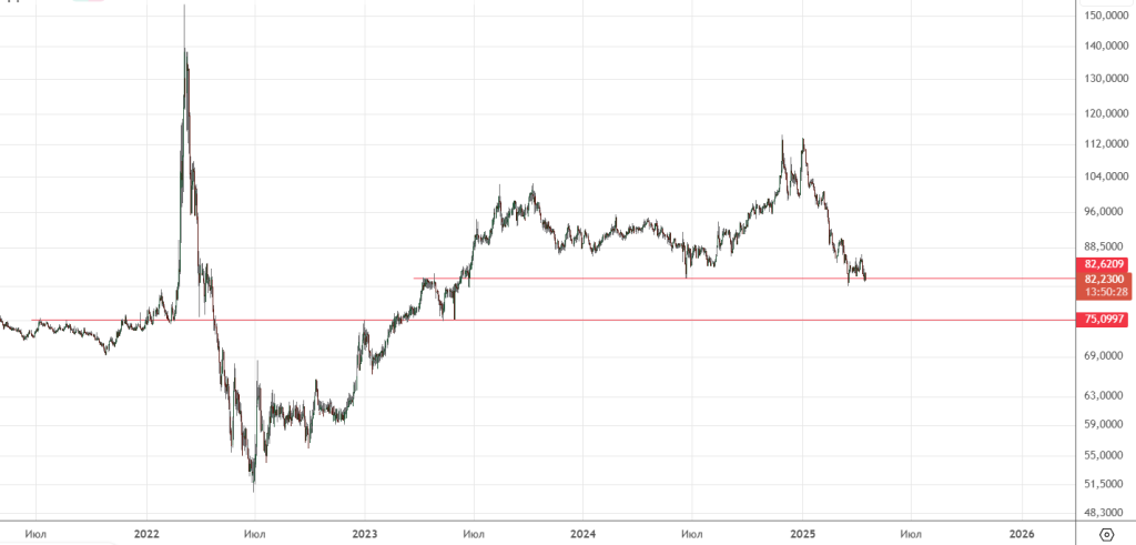 Была еще одна попытка обновить низы , отскочили вверх . В очередной раз тестируем важный уровень 82.2 , если закрепимся ниже и пробьем низы , то следующая цель район 75 ( там же уровень 0.612 от вершины)