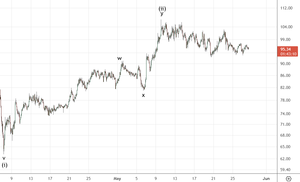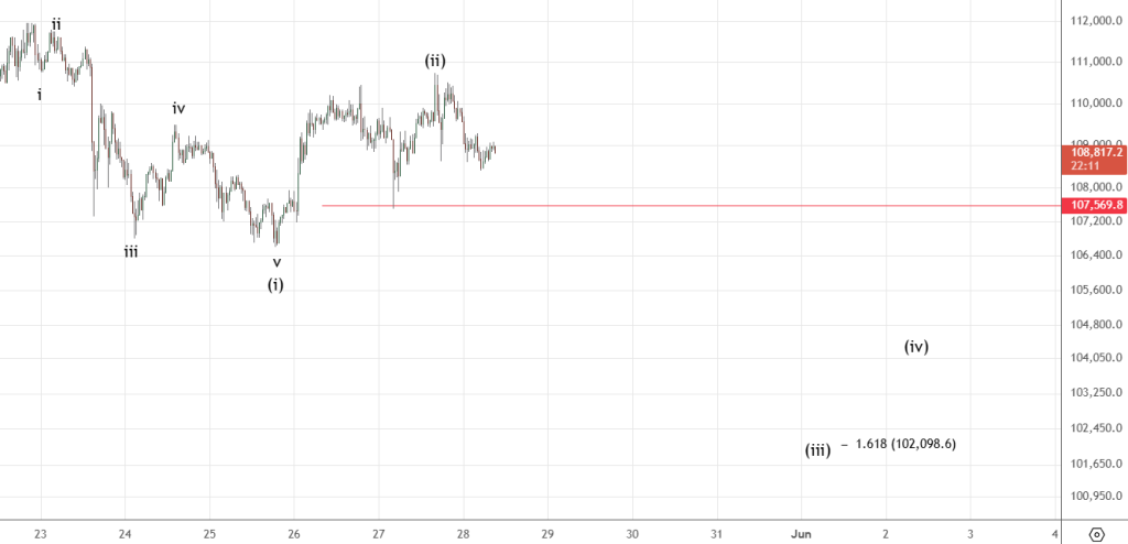 Есть спорный импульс вниз , к нему прошла коррекция (ii) . Важный уровень подтверждения — 107569 .