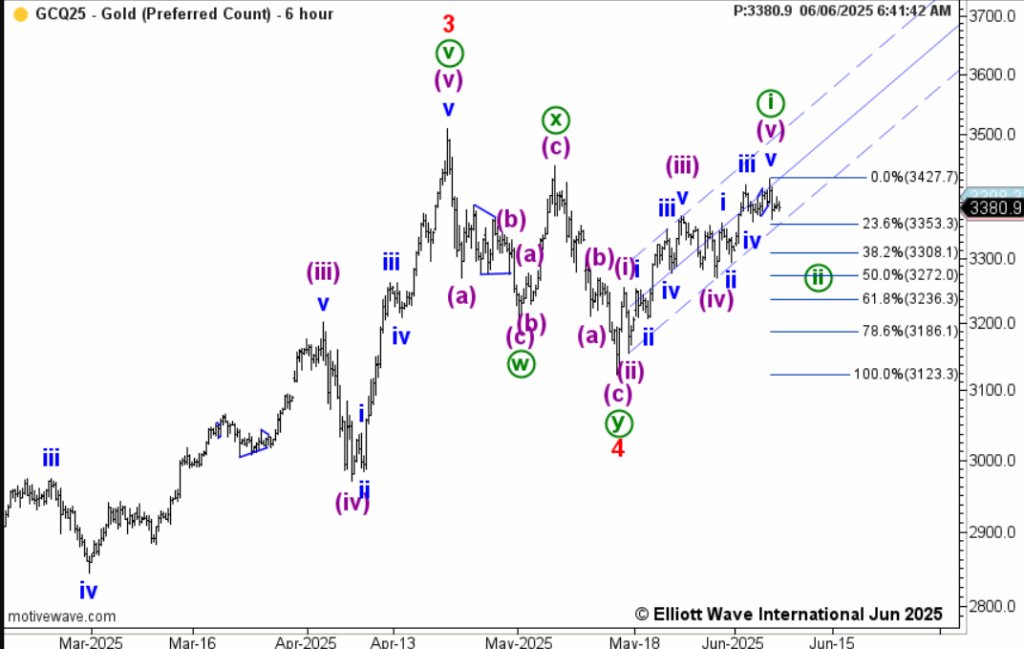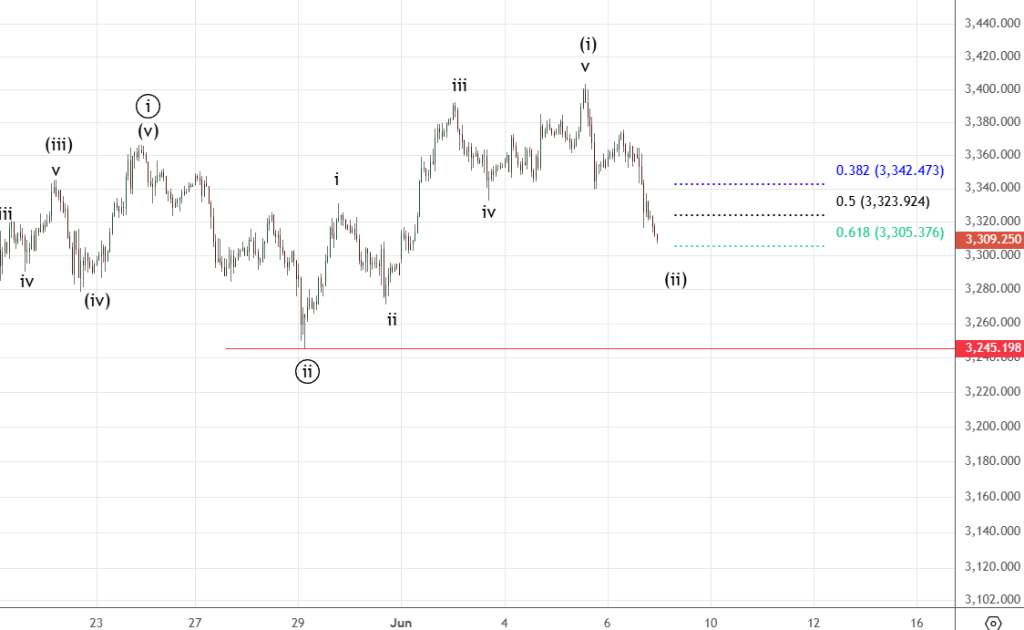 Пректер. У них другая интерпретация — завершилось все движение от 3123.3 (15 мая) и идет коррекция старшей степени ((ii)) , она может быть более глубокой. Разделяющий эти два варианта уровень — 3234.198.